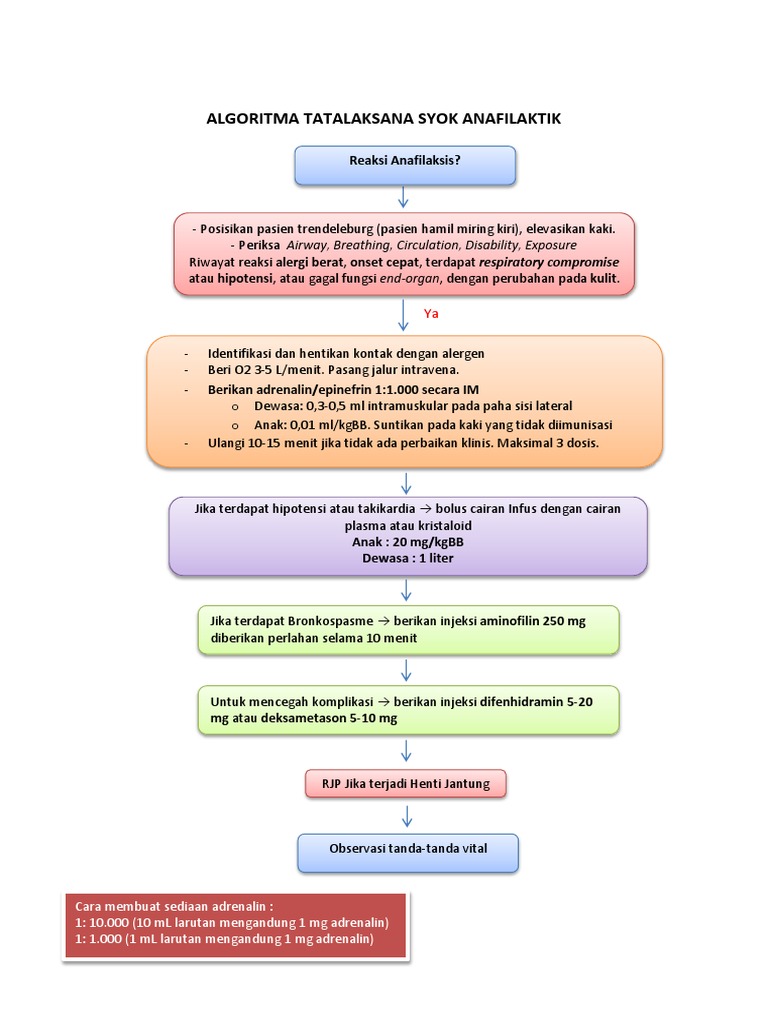 Pastikan untuk memindahkan sumber alergi seperti sengat lebah sebelum memberikan pertolongan lanjutan kepada pengidap. Penyuntikan Adrenalin 03 05 ml IM bila pasien mengalami reaksi syok setelah penyuntikan dengan tanda-tanda. Setelah kondisi pasien stabil dokter baru akan melakukan langkah-langkah di bawah ini untuk menentukan diagnosis syok anafilaksis.