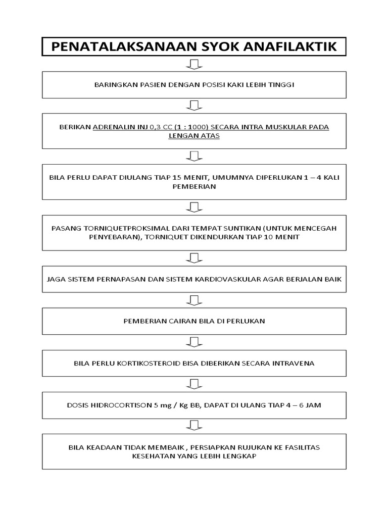 Penatalaksanaan anafilaksis meliputi penanganan pertama penanganan farmakologis lanjutan dan rujukan ke fasilitas kesehatan sekunder apabila diperlukan. Tujuan Sebagai Pedoman kerja bagi petugas medisparamedis dalam melakukan pelayanan penanganan Syok Anafilaktik.